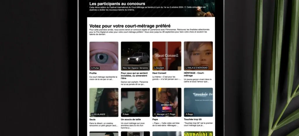 Dans le cadre d’une collaboration continue avec IPLN, nous avons eu l’opportunité de développer un site web pour le concours de courts métrages du festival Filmoramax. Ce projet ambitieux, entièrement réalisé en Symfony, visait à permettre aux cinéphiles et clients d’IPLN de voter pour leurs films préférés parmi une sélection de courts métrages. Nous avons créé un site sur mesure, intégrant un backoffice puissant pour gérer les vidéos et suivre les statistiques de vote. La direction artistique, inspirée par l’univers du cinéma, a mis l’accent sur un design épuré et sombre, tout en adoptant une approche mobile first pour assurer une expérience utilisateur optimale sur tous les appareils.